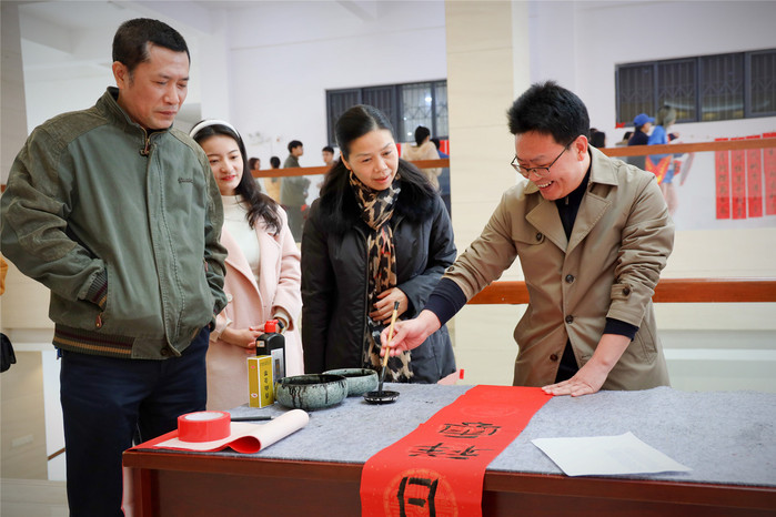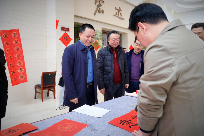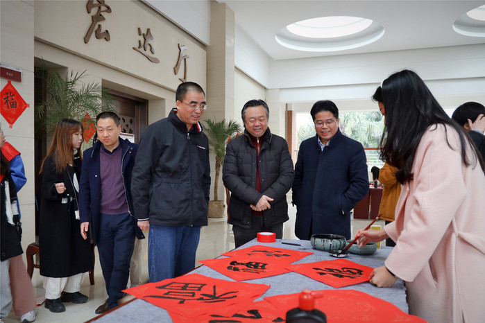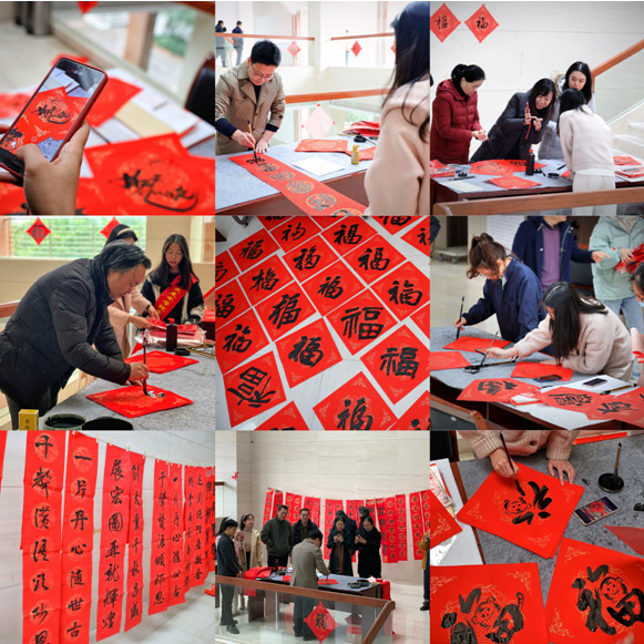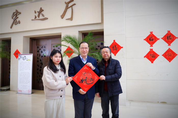 活动吸引了众多老师参与,现场其乐融融。大家驻足品赏、相互交流,挑选自己喜欢满意的书法作品,人人脸上洋溢着幸福笑容。活动期间,校领导王长平、陈晓红、郑家建、涂荣先后来到现场,与师生互送祝福。当天,共创作送出500多副春联和福文化创意作品。