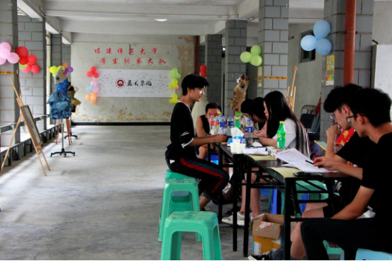 架空层已是布置一新,国画、油画、漆画、服装让大本营充满学院特色与文化气质。学长学姐们认真引导新生填写和递交材料,并耐心为新生一对一答疑解惑。