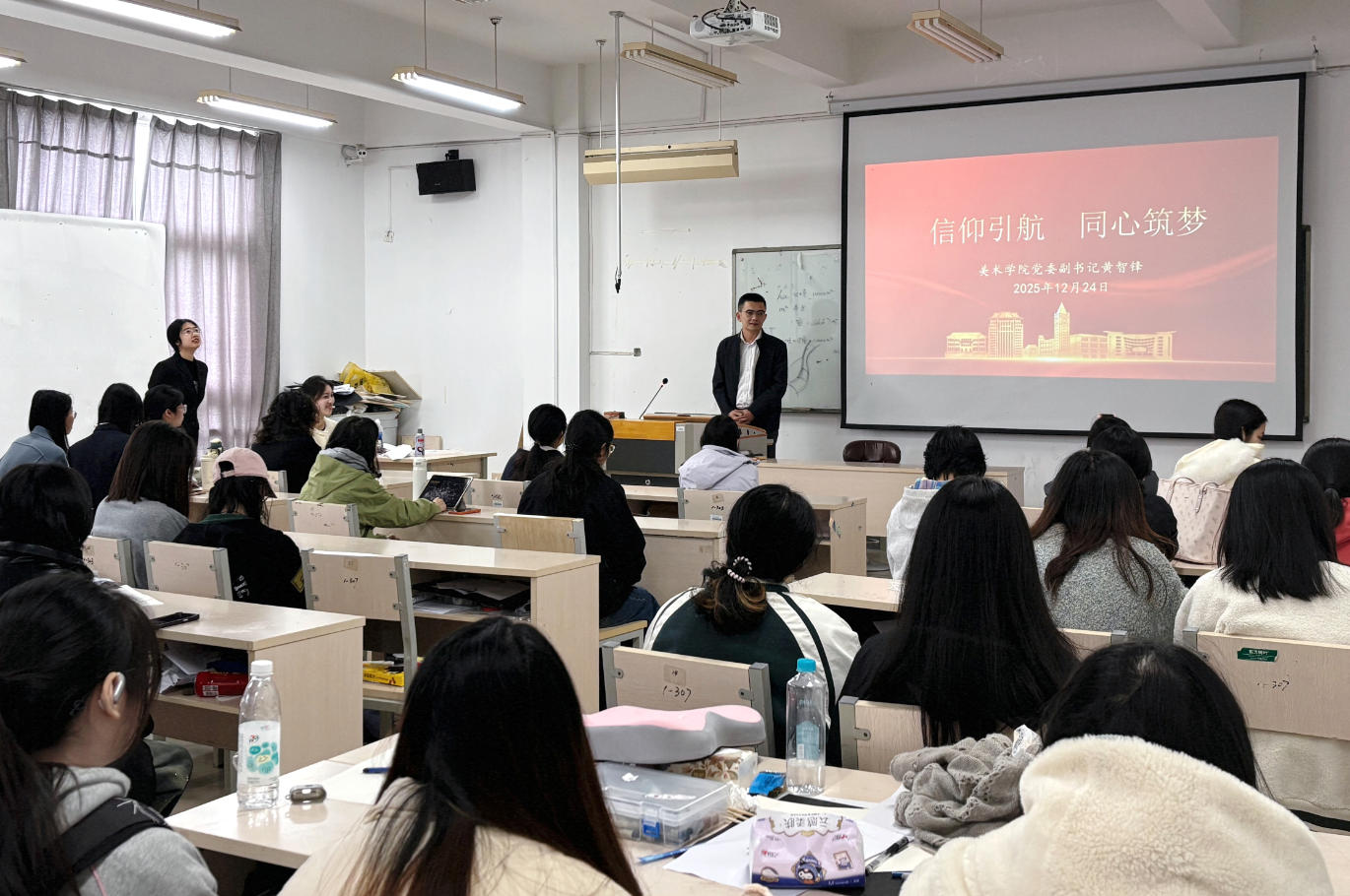 12月24日,美术学院党委副书记黄智锋以“信仰引航 同心筑梦”为主题,为2023级本科生代表讲授主题党课,并与同学们亲切交流,引导青年学子坚定理想信念、把稳人生航向。