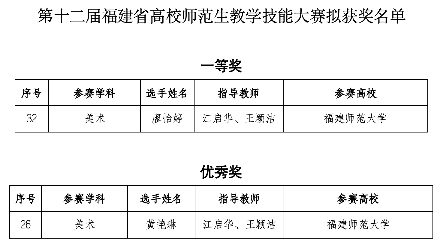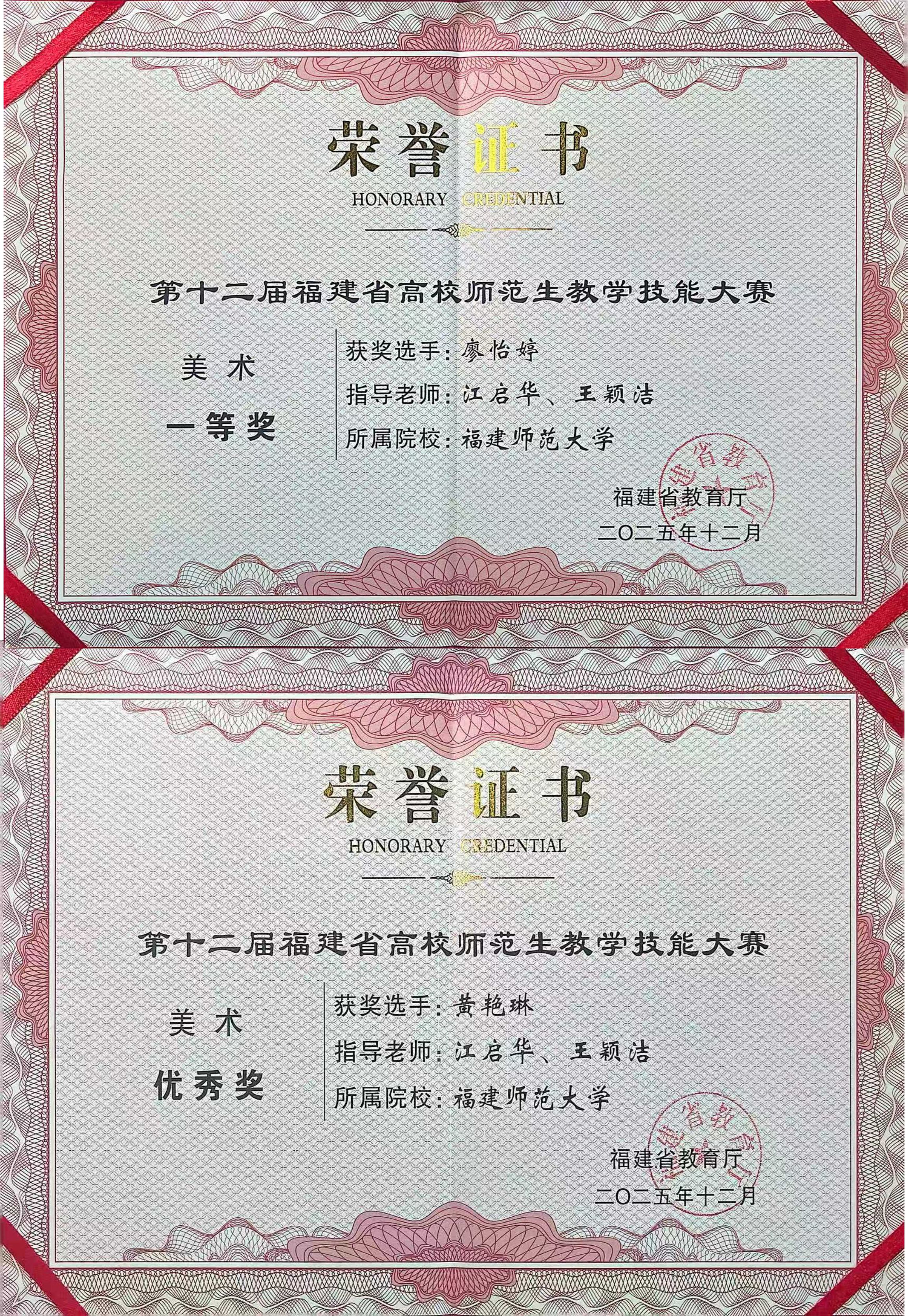12月6日,由福建省教育厅主办、宁德师范学院承办的第十二届福建省高校师范生教学技能大赛圆满落幕。福建师范大学美术学院2022级学子在初中美术组的激烈角逐中脱颖而出,成功斩获一等奖、优秀奖各一项,指导老师为江启华、王颖洁。