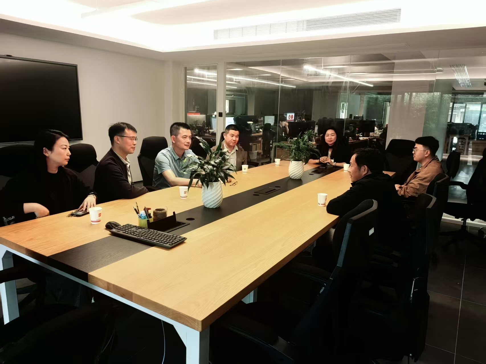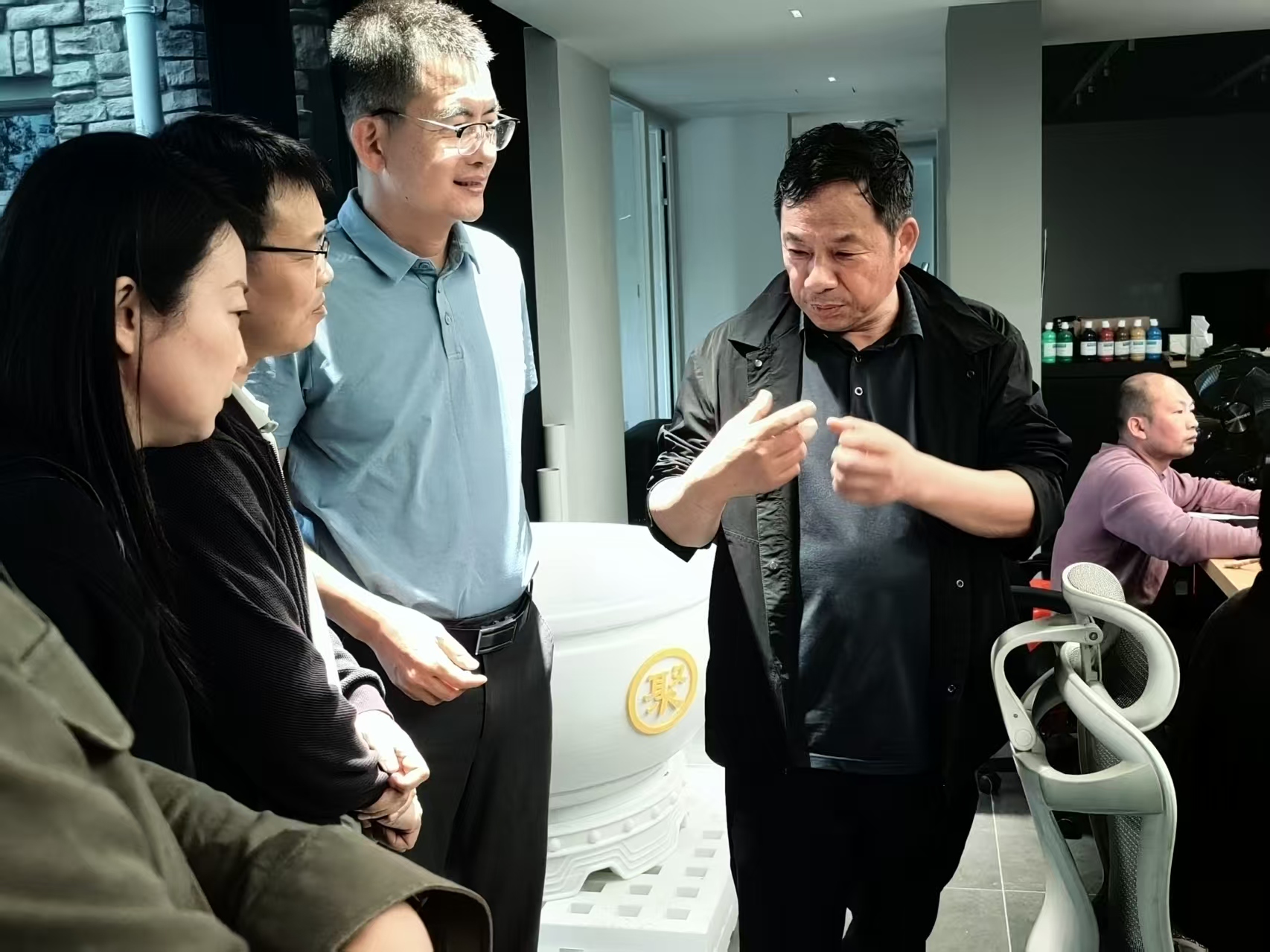 在公司董事长杨建的带领下,美术学院师生先后参观了该公司的设计空间、创作展馆等地,并现场参加座谈。