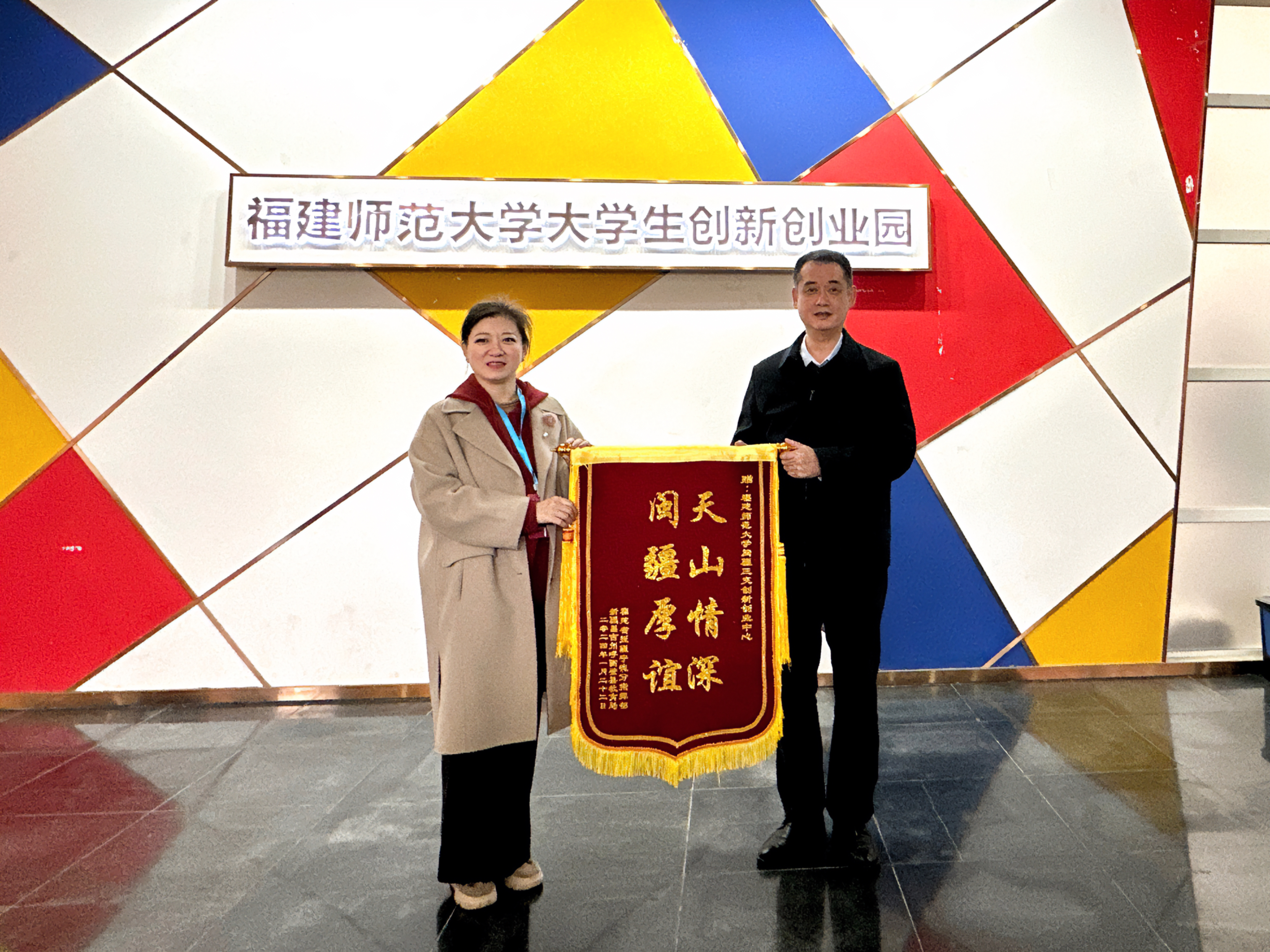 1月22日上午,“福建省援疆宁德分指挥部、新疆昌吉州呼图壁县教育局”向“福建师范大学闽疆三交创新创业文化中心”赠予锦旗。
